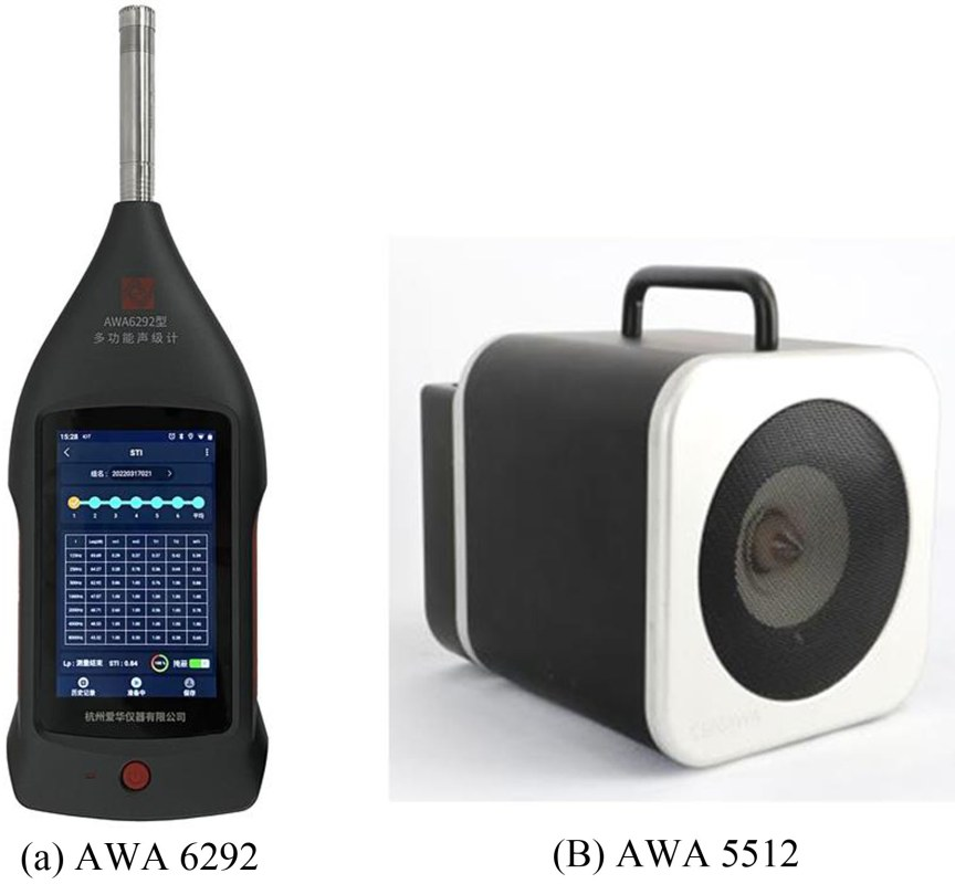 AWA6292型多功能聲級計如圖2(a)所示,是采用數(shù)字信號處理和物聯(lián)網(wǎng)技術(shù)的新一代手持式聲學測量儀器,性能符合GB/T 3785.1/IEC 61672-1對1級聲級計和GB/T 3241.1/IEC 61260-1對1級濾波器的要求,可以選擇工業(yè)噪聲測量、環(huán)境噪聲測量、職業(yè)衛(wèi)生噪聲測量和建筑聲學測量等模塊。當選用建筑聲學測量模塊時,配置總值積分測量、倍頻程和1/3倍頻程濾波器、混響時間測量和STIPA測量等軟件模塊,可以完成大多數(shù)建筑聲學測量項目,尤其適用于廳堂和室內(nèi)場所的聲學和擴聲特性測量。