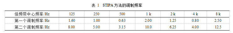 STIPA是完整STI的一種簡化形式,稱之為公共廣播系統(tǒng)語音傳輸指數(shù)。它是基于使用較少數(shù)量的調(diào)制指數(shù)進行的測量。STIPA測試信號僅由1個測試信號組成,在7個倍頻帶中的每一個波段都預設(shè)兩個調(diào)制如表1所示。這14個調(diào)制指數(shù)是同時產(chǎn)生的。一次測量時間僅需15~25s,比完整STI要短得多,是直接方法的主要應用途徑。調(diào)制指數(shù)也可以使用間接法得出,稱為STIPA(IR)。
